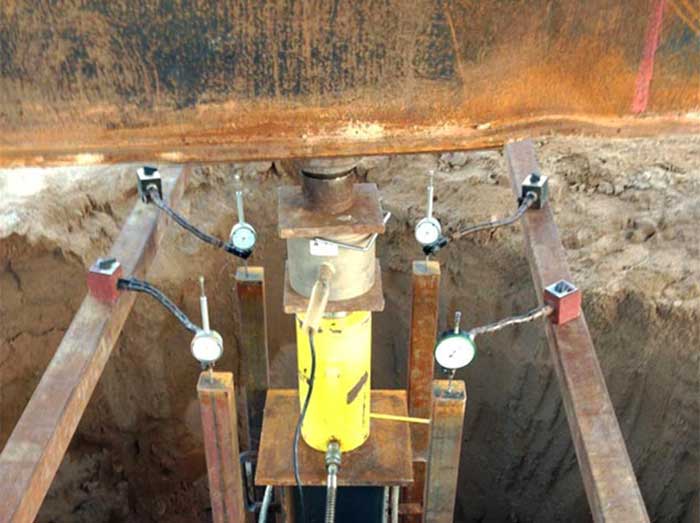 A norma brasileira que trata de provas de carga em fundação direta é a NBR 6489. Utilizando-se um cilindro hidráulico, são aplicados carregamentos verticais crescentes em estágios sobre uma placa de 80 cm de diâmetro, disposta em uma cava com a mesma profundidade da futura sapata. Registram-se os deslocamentos correspondentes às cargas aplicadas.